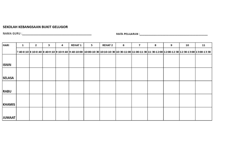 Muhammad afiq binameri waktu 1 2 3 4 5 6 7 8 9 10 11 12 730 - 800 800 - 830 830 - 900 900 - 930 930 - 1000 1000. T3 nilam waktu har1 740 810 810. Waktu Kosong Template Jadual Waktu Kelas Boleh Edit.